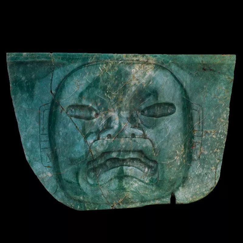 这件大块饰板很可能是像吊坠一样戴在胸前的,它在过去还要更大一些,现在则已经从一个可能被雕琢成蛤壳或勺子形状的凹面物体上切了下来。饰板制成的几个世纪之后,便落到了一位玛雅统治者的手里,他将自己的名字和头衔铭刻在饰板背面,表明其本人拥有从古代流传下来的珍贵遗物。
