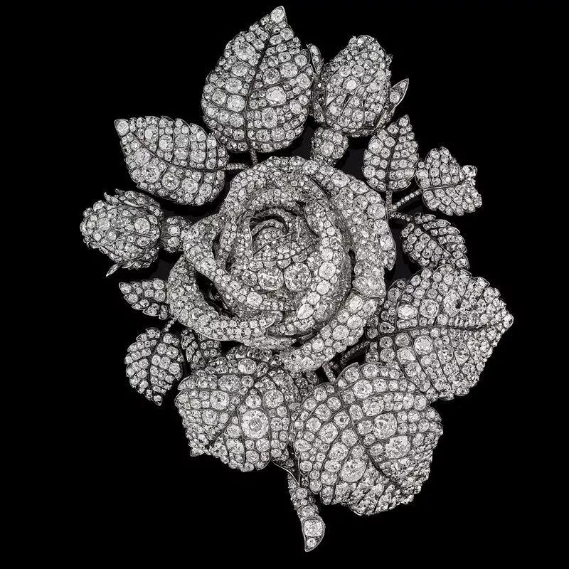 这枚玫瑰胸针是19世纪巴黎珠宝商人为玛蒂尔达公主的精心之作。玛蒂尔达公主是拿破仑三世的表亲和密友,她前往巴黎后,在公共活动中发挥了重要功能。首先是她的表亲、未来的拿破仑三世担任总统期间,之后是他1852年称帝开启第二帝国时期(1852-1870年),此时玛蒂尔达公主的地位仅次于欧仁妮皇后。她将一些珠宝馈赠给家庭成员,其他的珠宝在1904年的巴黎被拍卖。路易斯·卡地亚非常欣赏这枚玫瑰胸针,他从拍卖的买家那里买下了这枚胸针,并在之后将其卖给了科尼利厄斯·范德比尔特三世夫人。这位夫人居住在曼哈顿一座拥有70个房间的宫殿里,是纽约社交圈半个世纪来的女王。