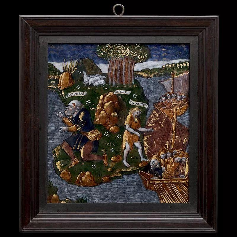 “波吕斐摩斯和阿基米德”是四块饰板之一,构成一个系列的一部分,与其他饰板共同构成了已知最早的描述世俗主题的里摩日珐琅作品。