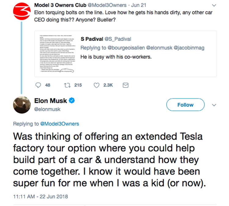马斯克对这个想法很感兴趣,他说如果我还是一个孩子,亲自参与一辆汽车的制造这对我来说会非常有意思,但是又表示这个项目的运营非常困难。2016 年,特斯拉就曾试图推动一项名为「特斯拉旅游「的法案,但未获告捷。