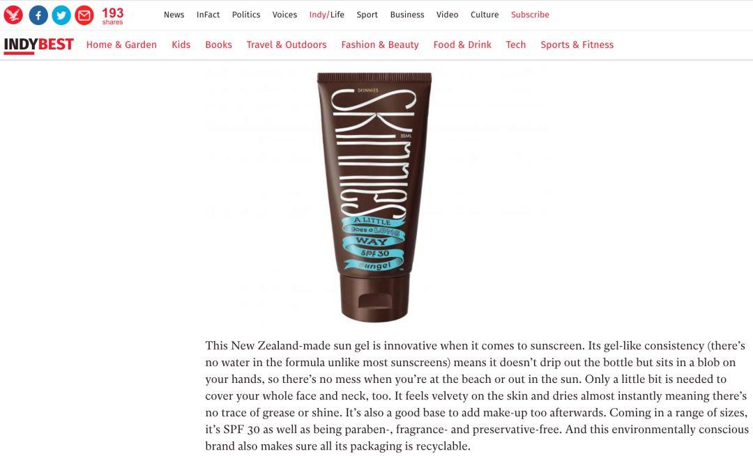 英国独立日报更是在2017年的防晒霜评选中,将skinnies列在了最好用的13款产品的名单中~