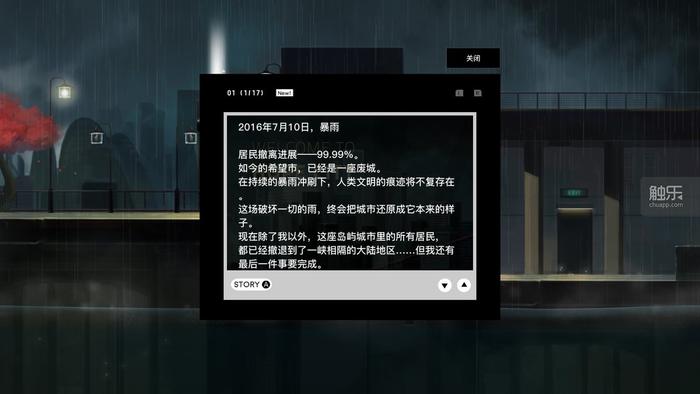 一个披着雨衣的无言女孩,在这个被雨水淹没的城市里,从8楼的天台乘坐电梯向下,一步步点亮所有灯火石碑,让9120米的水位逐渐退去。没人知道她从何而来、为何而来,所有的真相就藏在最深的水底。这些故事都是游戏后来慢慢告诉我的。