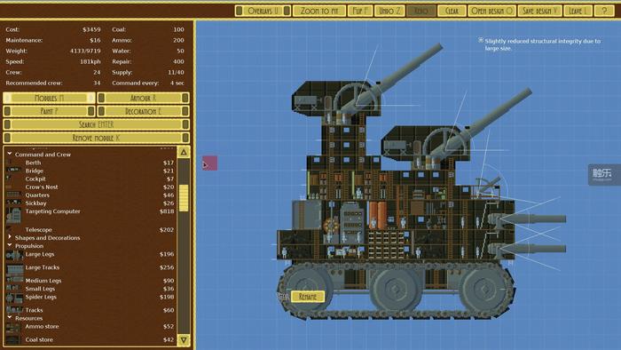 我最终认识到,这款游戏出人意料地非常具有策略深度,完成教程后造出来的飞艇只能说是徒具其型,一遇上稍微强的敌人就会被打爆,Steam中关于飞艇结构的指南写得专业又复杂,活脱脱一本蒸汽朋克版本的《航天飞行器设计》。不过游戏能够导入其他人的飞艇设计,贴吧和创意工坊也有不少人分享了不错的方案,能够直接拿来参考。