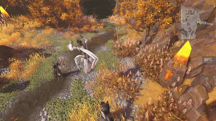 进入游戏后的第一个场景——光明野展现出了一定的设计与美术功底,金黄的地表植被、蓝色的水面与天空、远景的白色雪山,形成了鲜明的色彩对比。另外,相比前作频繁的读取,本作在第一块地图上几乎是无缝衔接的,视野也很开阔。