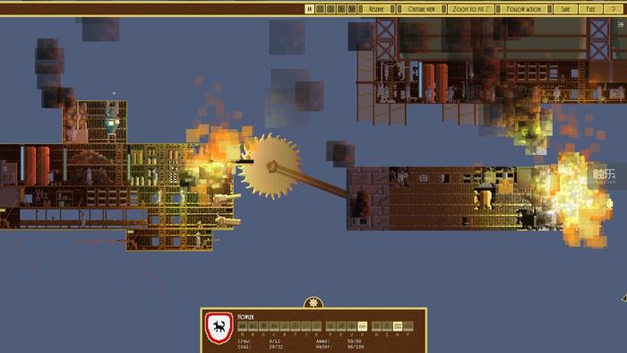 这些*器武**让游戏在战斗上的风味十足,观赏性也非常出色,大电锯吱呀吱呀地在敌人的船体里切来切去,几十门大炮一起开火,空中飞溅着各式各样的像素块,黑烟和火光直冒,实在符合多炮塔神教和蒸汽朋克爱好者们的美学。