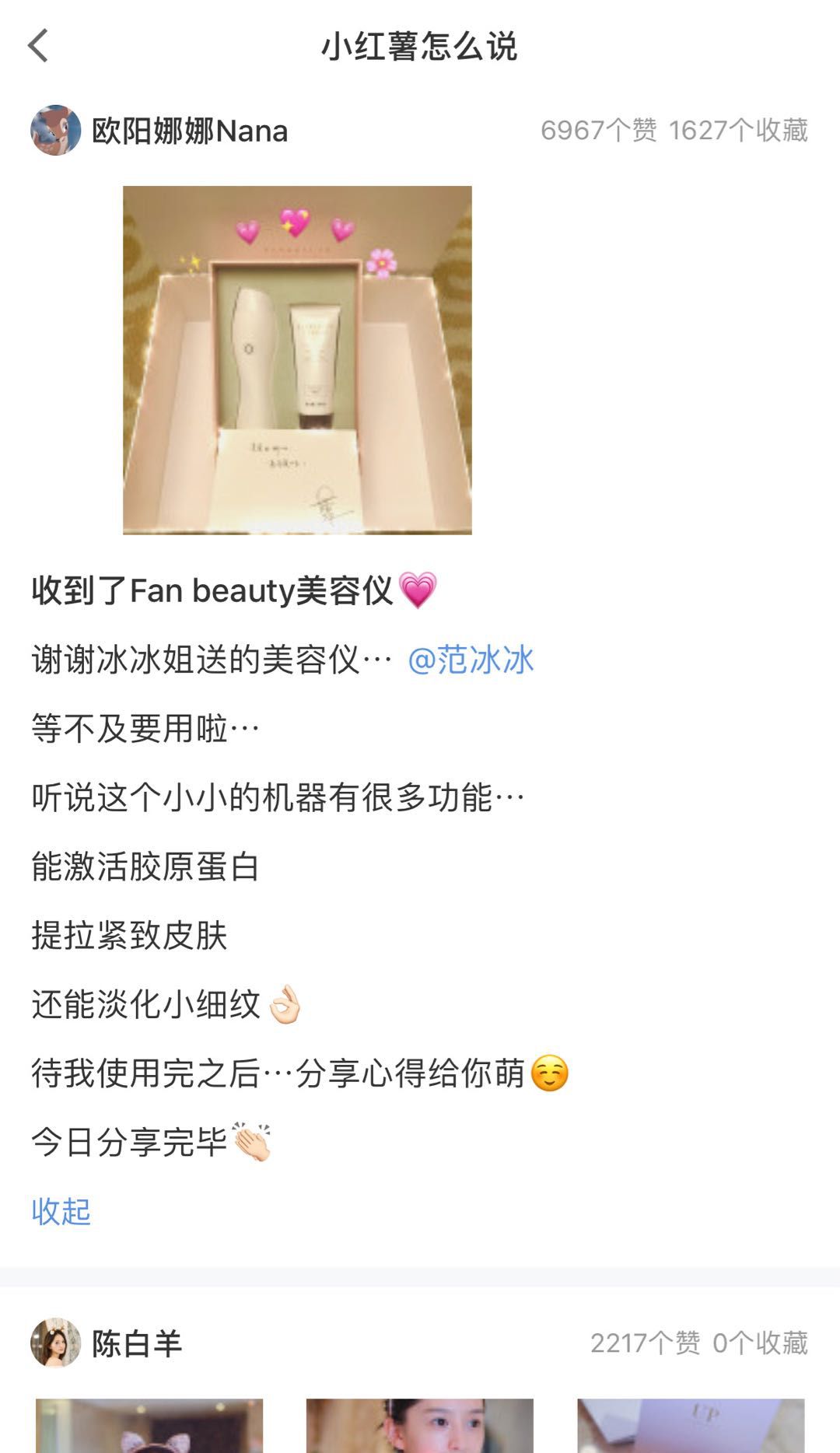 18年3月,范冰冰创立并发布了自己的美妆品牌--FAN BEAUTY,这个限时特价2399元的射频美容仪,获得各路明星好评加持。通过评论看,销量也是势如破竹。KOL效应,使得小红书与明星之间取得双赢,越来越多的明星加入小红书发布PGC,良性循环,有了更多的KOL。