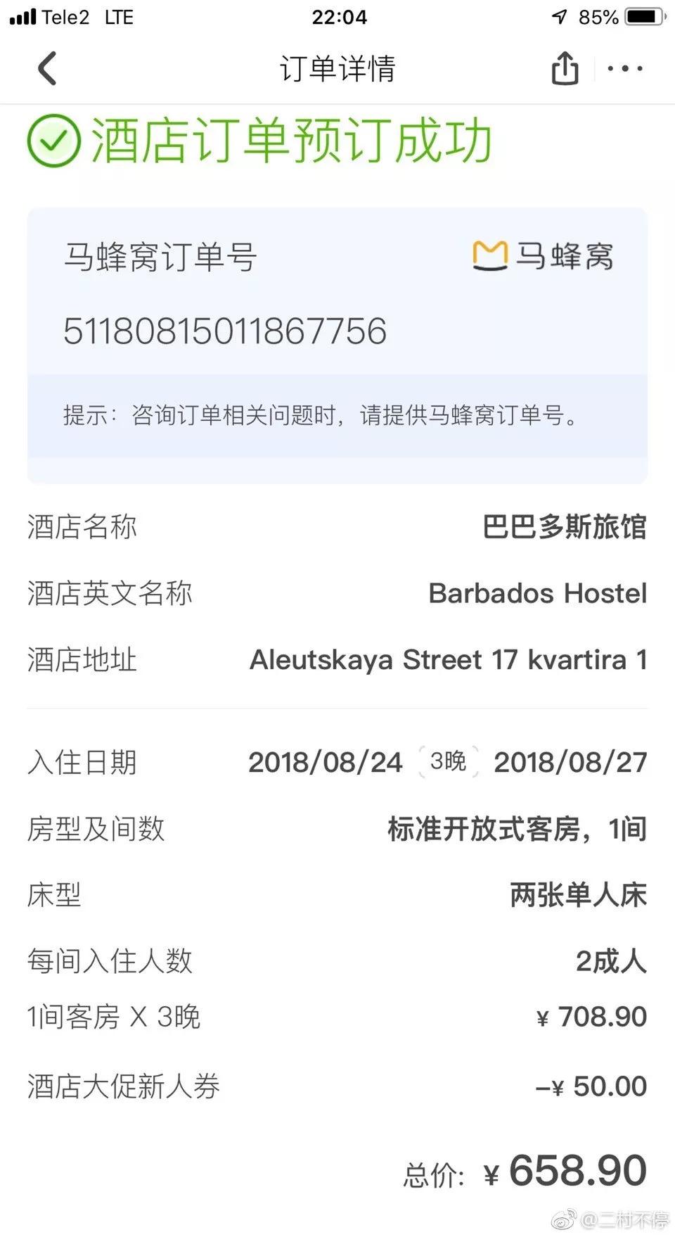@二村不停详细描述了事情经过:8月15日,自己在马蜂窝预订了海参崴巴巴多斯旅馆(Barbados Hostel)08月24日至08月27日共3个晚上的住宿。