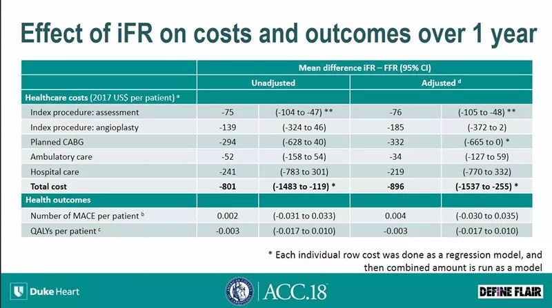 昨日,研究者在本次ACC会议上又发布了该研究的另一结果,进一步比较了iFR和FFR指导血运重建策略1年时的卫生经济学效应。首先对两组患者住院期间生成的所有费用包括手术相关和PCI治疗相关的费用进行收集汇总,随后又对1年随访过程的临床用药、特殊就诊和MACE事件处理等相关费用进行收集。同时对患者生活质量进行问卷调查,并以质量调整的生命年为指标,采用标准卫生经济学的相关统计分析。最终发现,iFR指导的血运重建在患者的生活质量和MACE事件发生情况不劣于FFR的情况下,能够带来更好的卫生经济学效应,减少医疗费用近九百美元。