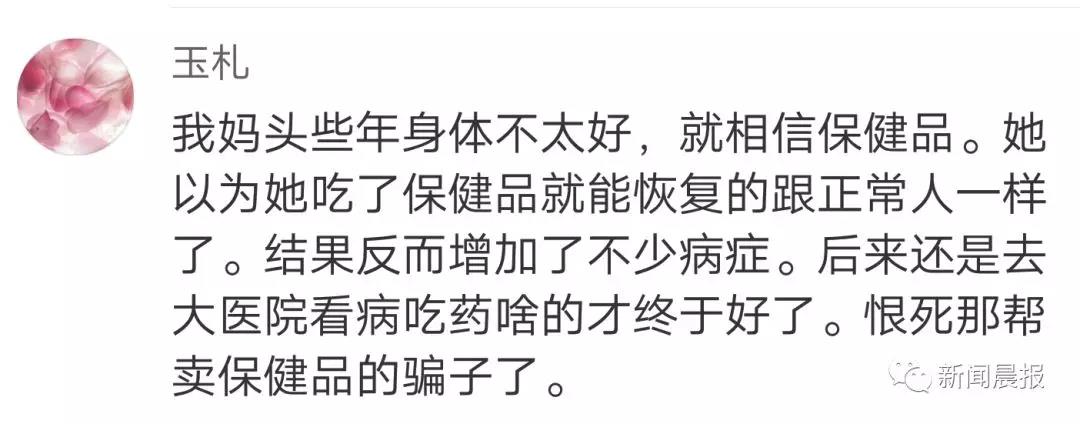 1995年她查出糖尿病,开始接触、购买保健品。后来丈夫及亲戚因癌症去世后,她越来越恐惧,寄托在保健品上的希望也越来越大。