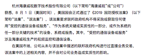 据雷锋网了解,8月3日早间,海康威视(002415)对此发布公告称,美国国会于美国时间8月1日正式通过的《2019国防授权法案》,不会对公司业务造成实质性的影响。
