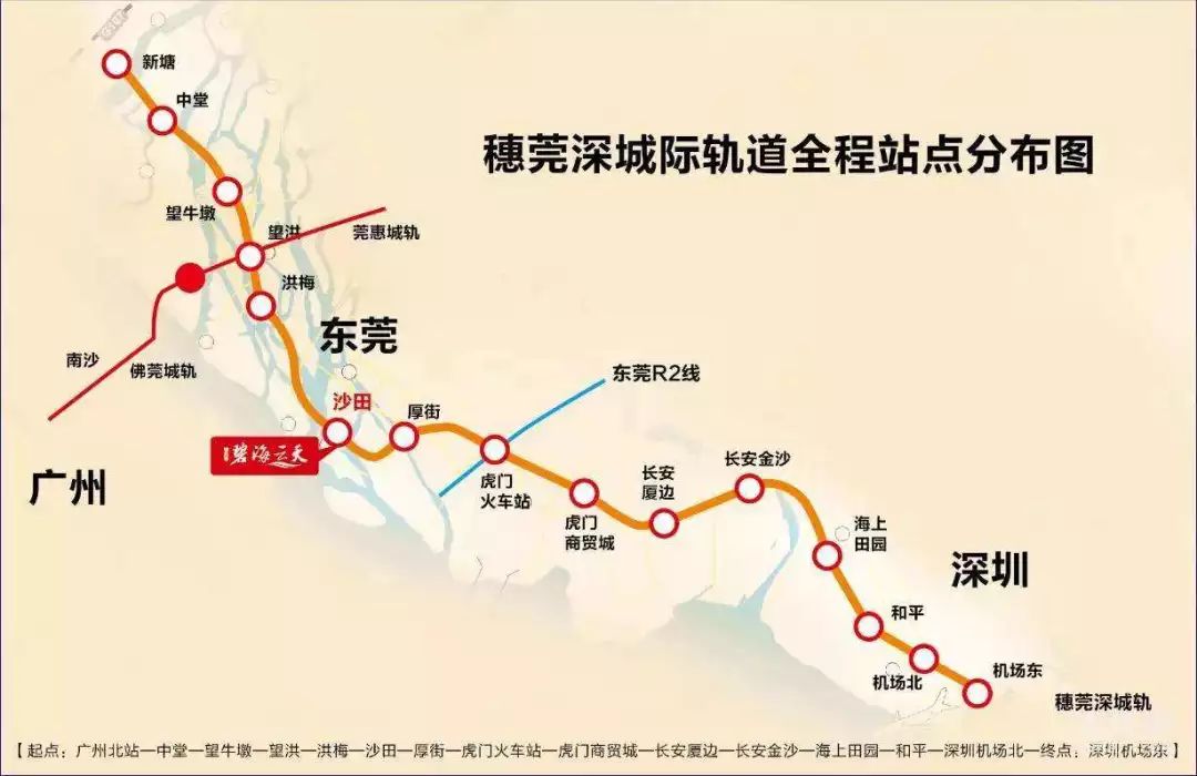 穗莞深城际线起点为广州东站,广州东至新塘段利用既有广深线,新建广州新塘,经东莞至深圳机场段,全长约76公里,设15座车站,深圳境内设4座车站,分别为海上田园、和平、深圳机场北、深圳机场,计划2018年建成开通,未来远期将南延至前海。