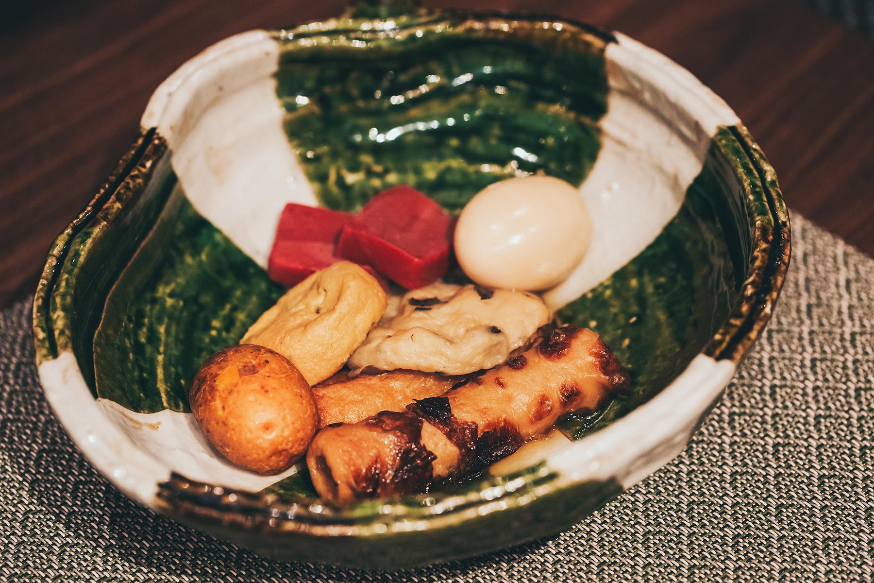 白萝卜/港币 $40;赤蒟蒻、炸鱼饼、竹轮卷/各港币 $35;和风杂菜鱼腐、北海道马铃薯、鸡蛋/各港币 $25
