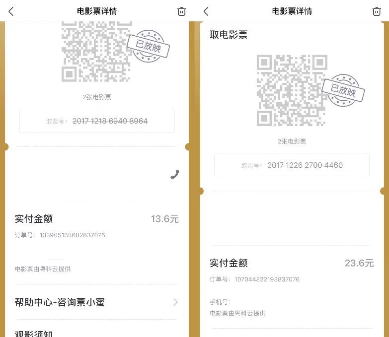 一种是猫眼或者淘票票提前1-2周预订快上映的电影,经常有9.9,19.9的特惠购票福利,一个账户能够买2张票。比如下图是我之前买的电影票,都是2张的,价格分别是14元和24元,很便宜。