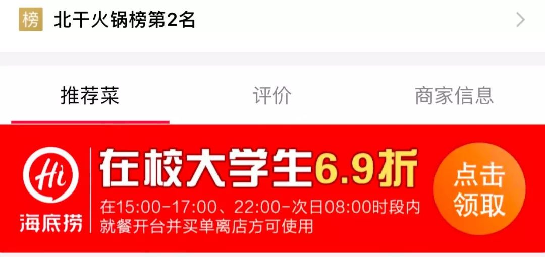 海底捞大学生6.9折优惠:如果你是在读大学生(研究生也能够),能够在支付宝或者口碑里面领取大学生折扣,然后在规定的时间段内消费能够享受6.9折,这个折扣和30元优惠券这些不能叠加,需要在支付宝里面认证学籍信息才能享受折扣。