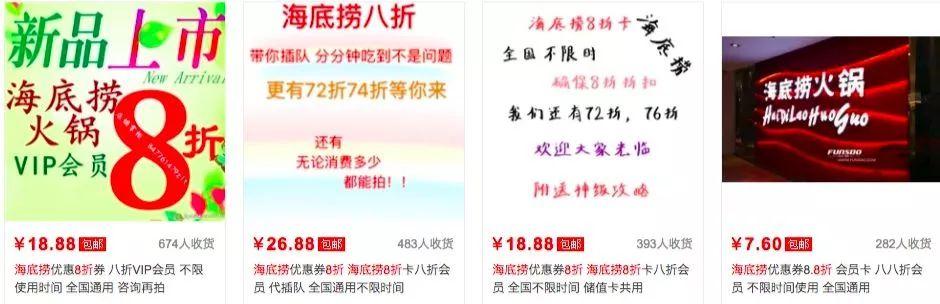 海底捞8折优惠:直接在淘宝上搜索海底捞8折优惠,花20元左右拍下商品,店主会发你一个海底捞的会员账号,用它的这个会员账号,在全国绝大都数的海底捞门店都能够享受8折优惠,不限制时间,但是需要提前和店主沟通好,如果人多的话,这个优惠力度也不错!