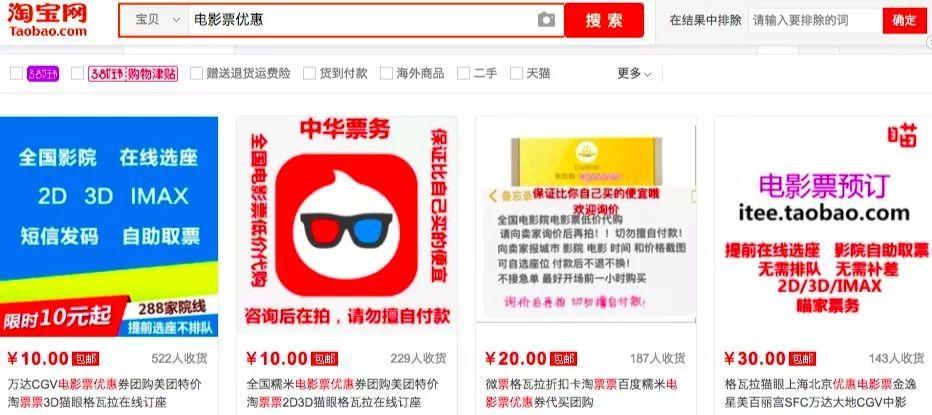 如果平台没啥优惠的话,大家能够在淘宝上搜索“电影票优惠”,像万达、CGV各种全国连锁的影院都能够优惠,把你想买票的时间和地点告诉店家,他能够每张便宜5-10块钱帮你订票,然后把二维码发给你,你直接去电影院取票就能够了。