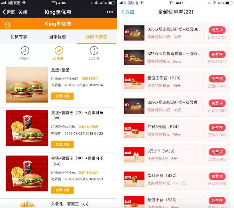 下面图片左边是汉堡王公众号,能够在当季优惠和会员专享中领取优惠券,比如我之前领过的双皇堡33元,皇堡+薯条+可乐=25元,挺实惠的,右边是口碑上领取的汉堡王优惠券,口碑上的优惠券种类和类别更多,但是折扣力度没有公众号那边大。