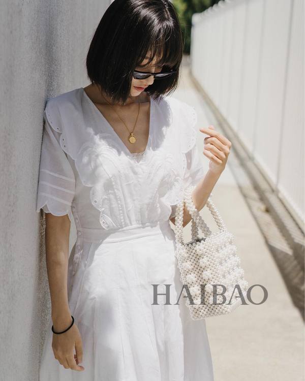 除了与Powerful的西服套装,珍珠串珠包搭起夏季必备小白裙也是绰绰有余,白+白的色彩组合不抢戏又很出镜。或者是黄白撞色的小包,像是菜篮子又过分迷你,随意拎着都是一套Look的加分点。