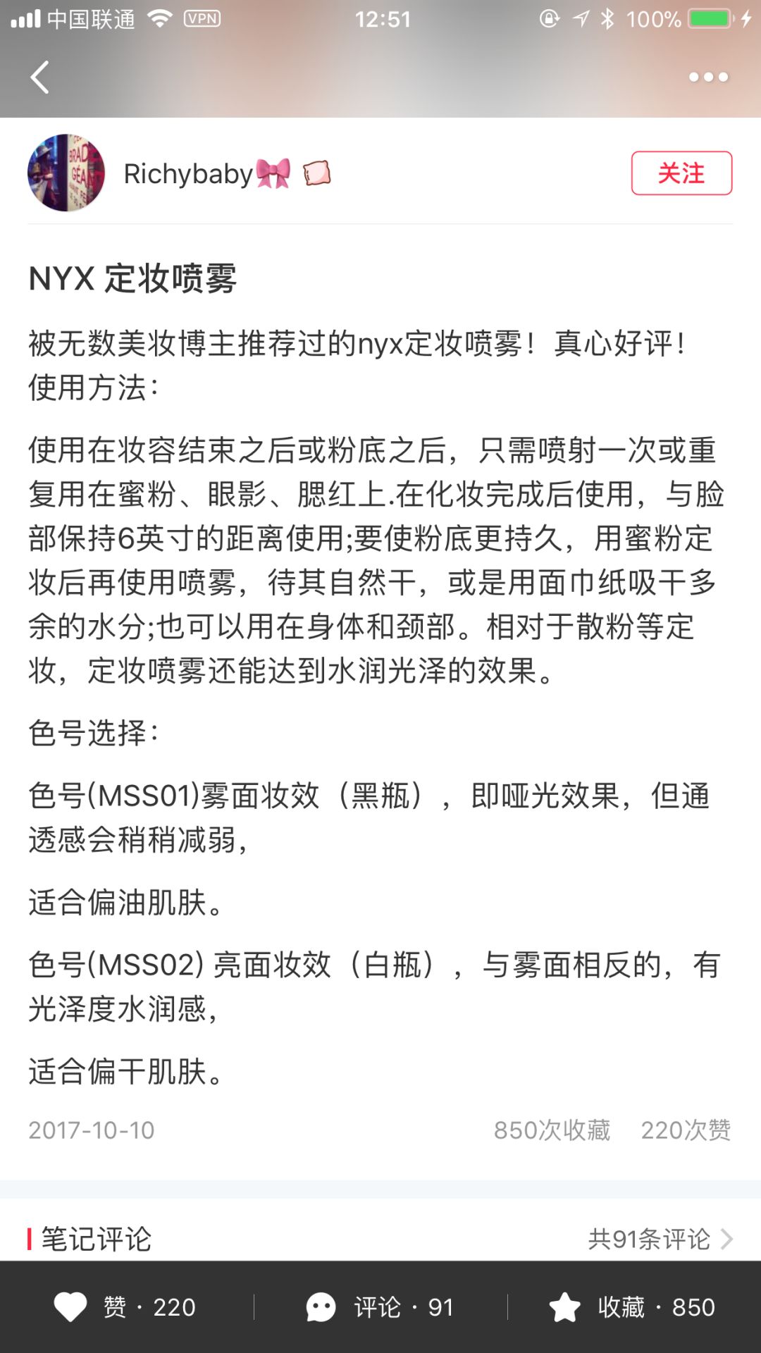 上面推荐的这款是合适干皮的光面喷雾,如果你是油皮妹子就不要尝试了哦~能够购买下面这款雾面喷雾,妆效一样高级。
