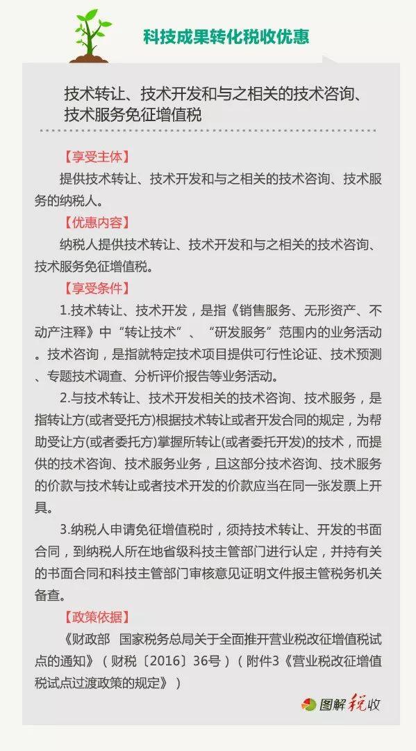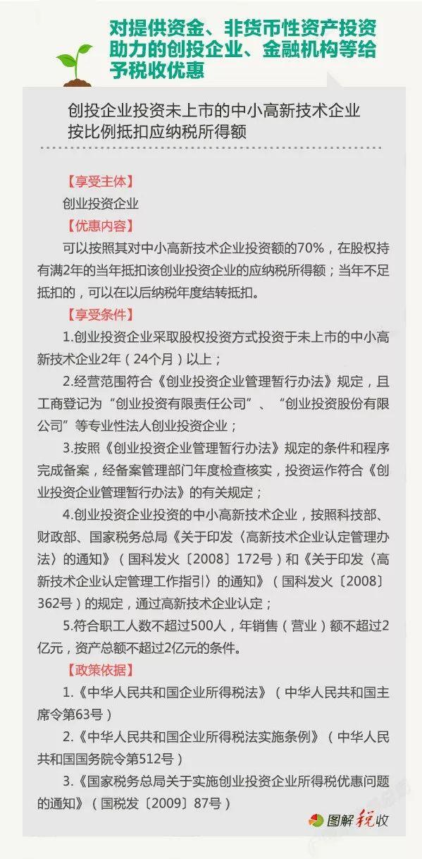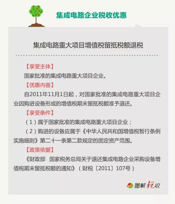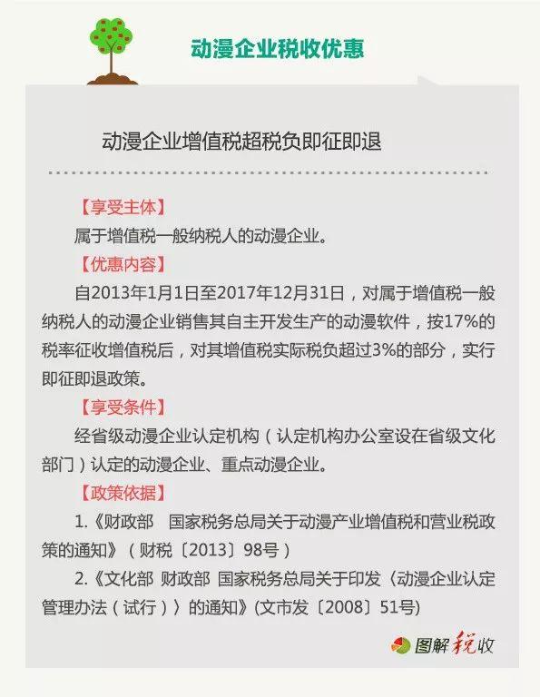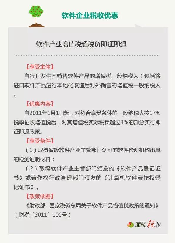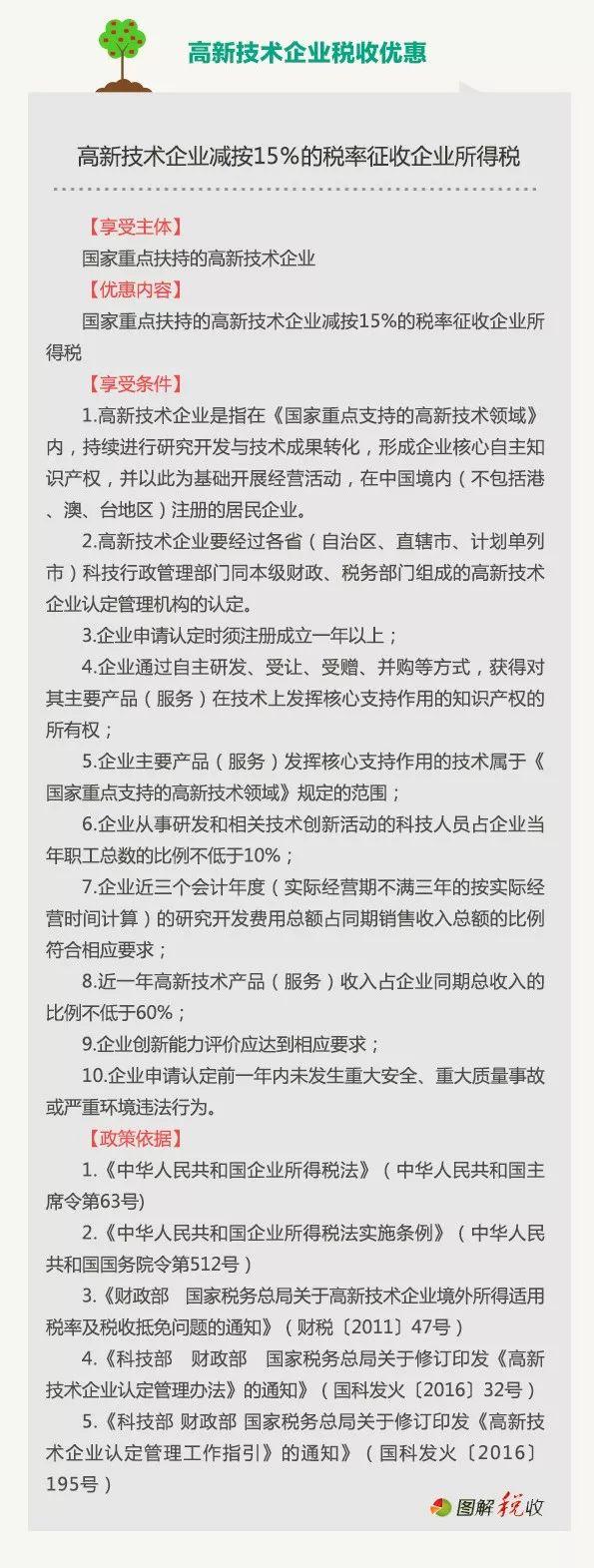 发展壮大有成长性的企业,同样具有税收政策优势,国家充分补给“营养”,助力企业枝繁叶茂、独木成林。目前税收优惠政策覆盖科技创新活动的各个环节领域,帮助抢占科技制高点的创新型企业加快追赶的步伐。对高新技术企业减按15%的税率征收企业所得税,并不断扩大高新技术企业认定范围。对处于服务外包示范城市和国家服务贸易创新发展试点城市地区的技术先进型服务企业,减按15%的税率征收企业所得税。对软件和集成电路企业,能够享受“两免三减半”等企业所得税优惠,尤其是国家规划布局内的重点企业,可减按10%的税率征收企业所得税。对自行开发生产的计算机软件产品、集成电路重大项目企业还给予增值税期末留抵税额退税的优惠。