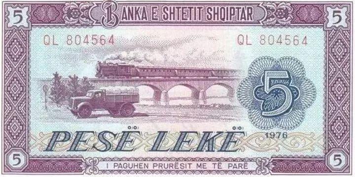 在阿1964版和1976版5列克流通纸币上,除标注的印刷版别有所不同外,其他图案完全相同。其正面图案均为一艘正在航行的货轮,背面图案则均为疾驰在大桥上的列车和满载货物行驶在公路上的中国解放牌CA10型汽车。