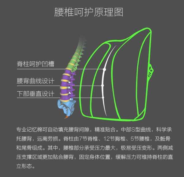 根据人体脊椎曲率优化,全贴合弧度设计,有效承托面积增大50%,降低并释放腰背部承受压力,使用时间越久,使用后的舒适度越持久,呵护脊椎的同时,避免压迫神经而引起的肢体麻木。