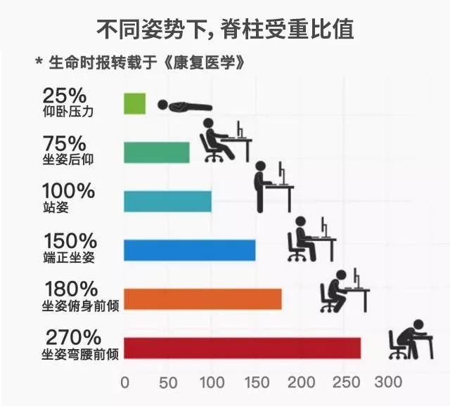 人坐着的时候,不良姿势下脊柱所承受的压力可高达270%,几乎等于3个自己踩着自己的腰在不停地跳, 长年累月下来所造成的慢性伤害却往往被人们所忽视。