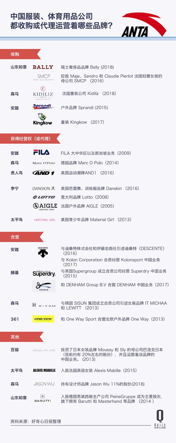 除了 FILA ,安踏手中已经有了一系列海外品牌。它分别和日本品牌迪桑特(Descente)、韩国户外 Kolonsport 的母公司合营着二者在中国区的业务。它还收购了主打健步鞋的 Sprandi 和香港童装小笑牛(Kingkow)。