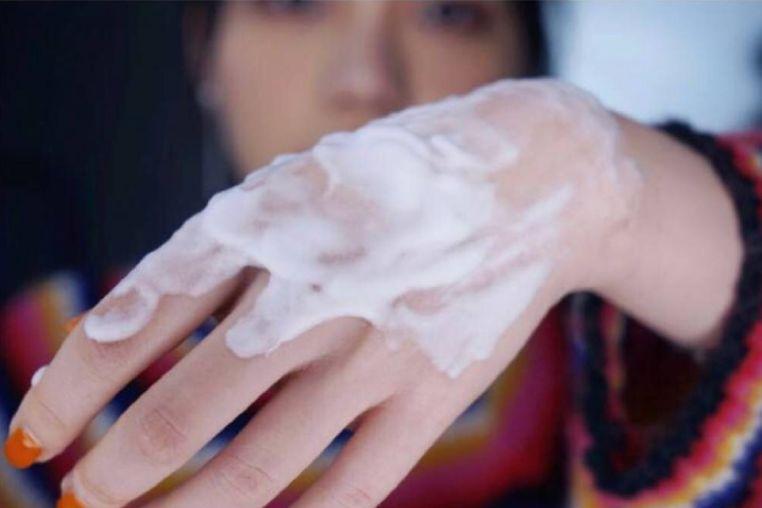挤压出来是白色乳液状质地,双手打湿后能够搓出浓密泡泡。